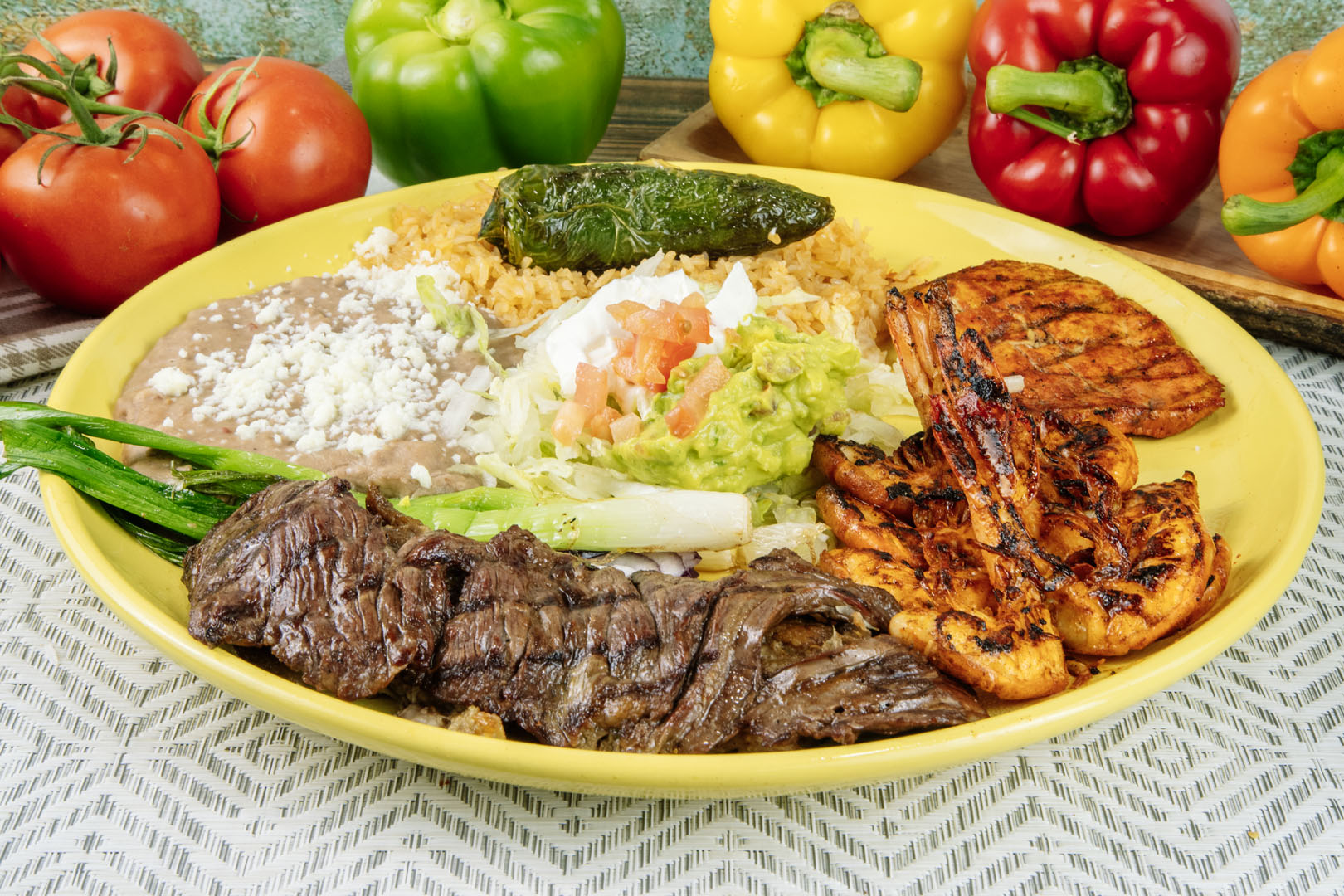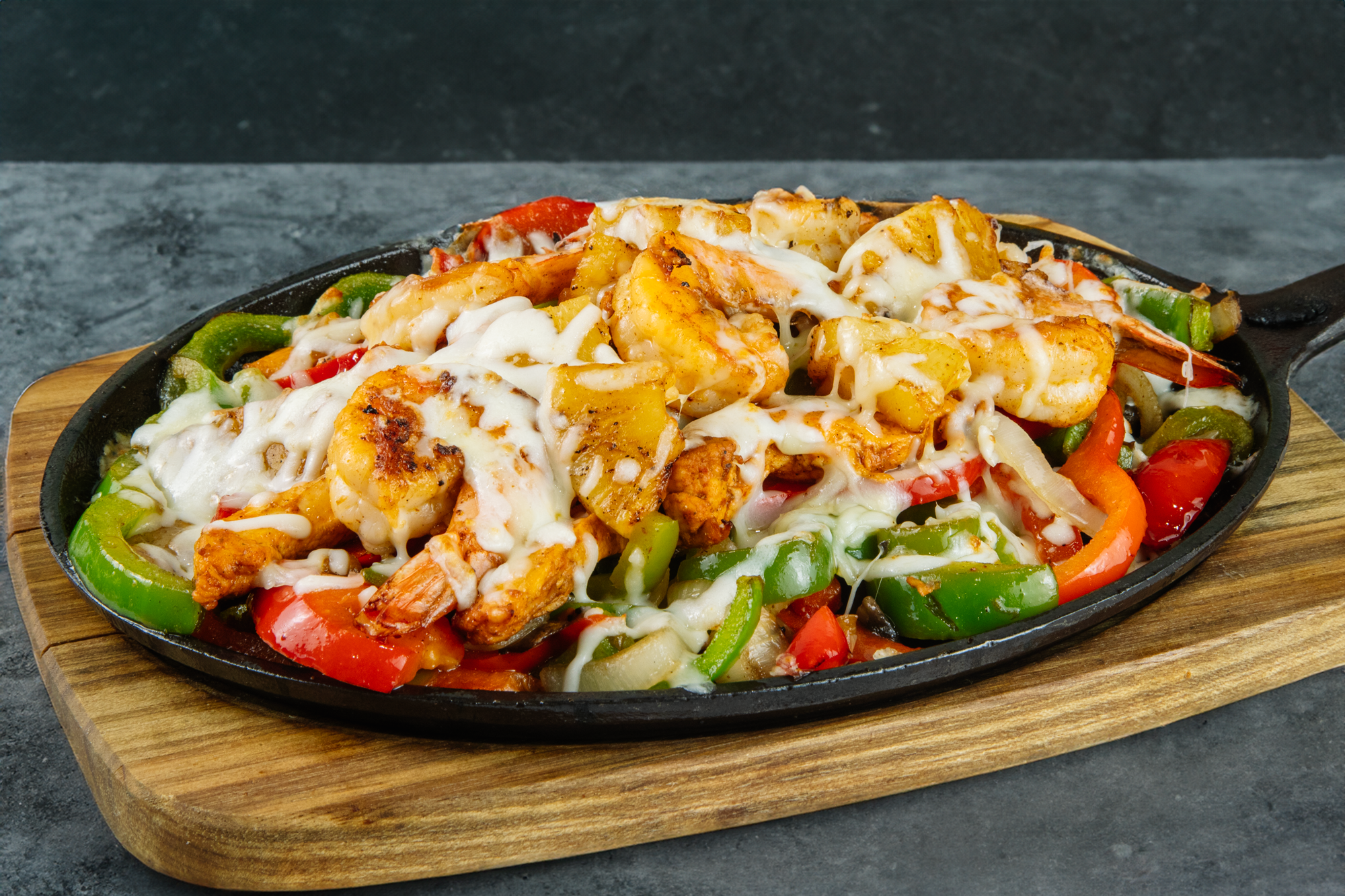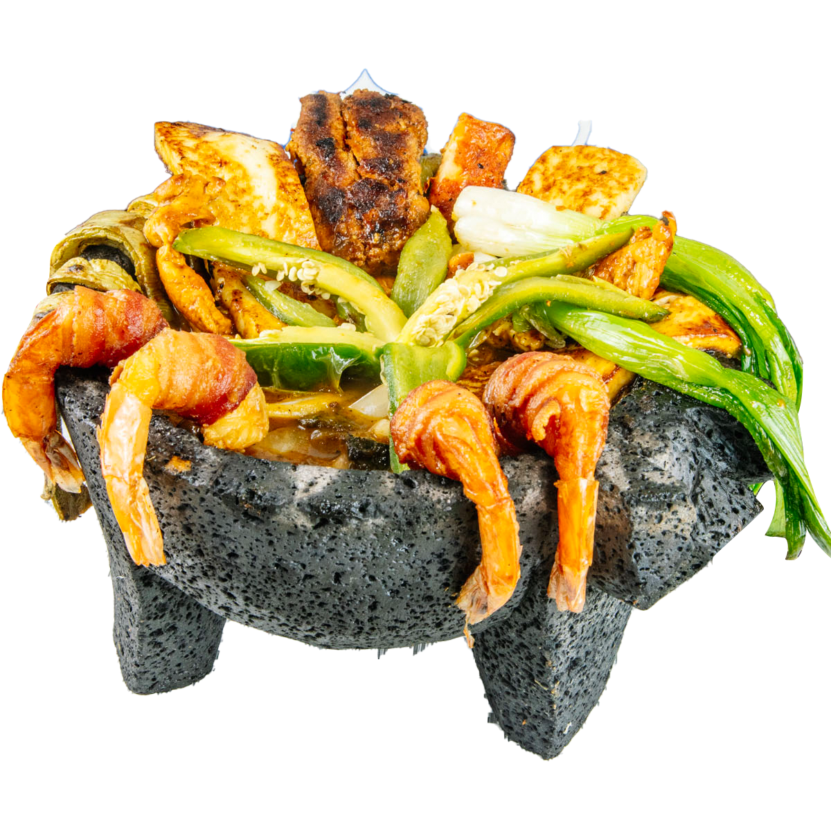 Chicken, steak, shrimp in wrapped bacon, cactus, green onions, jalapeño, cheese in special sauce. Sauteed in onions & mushroom.