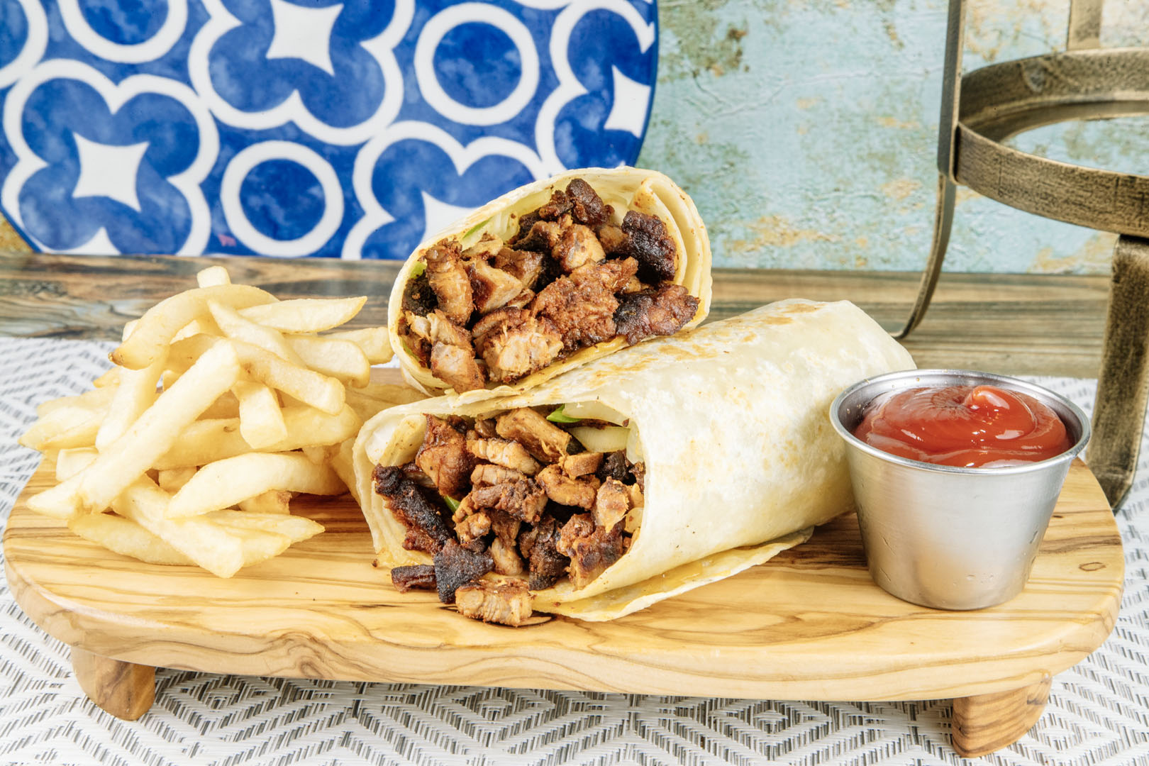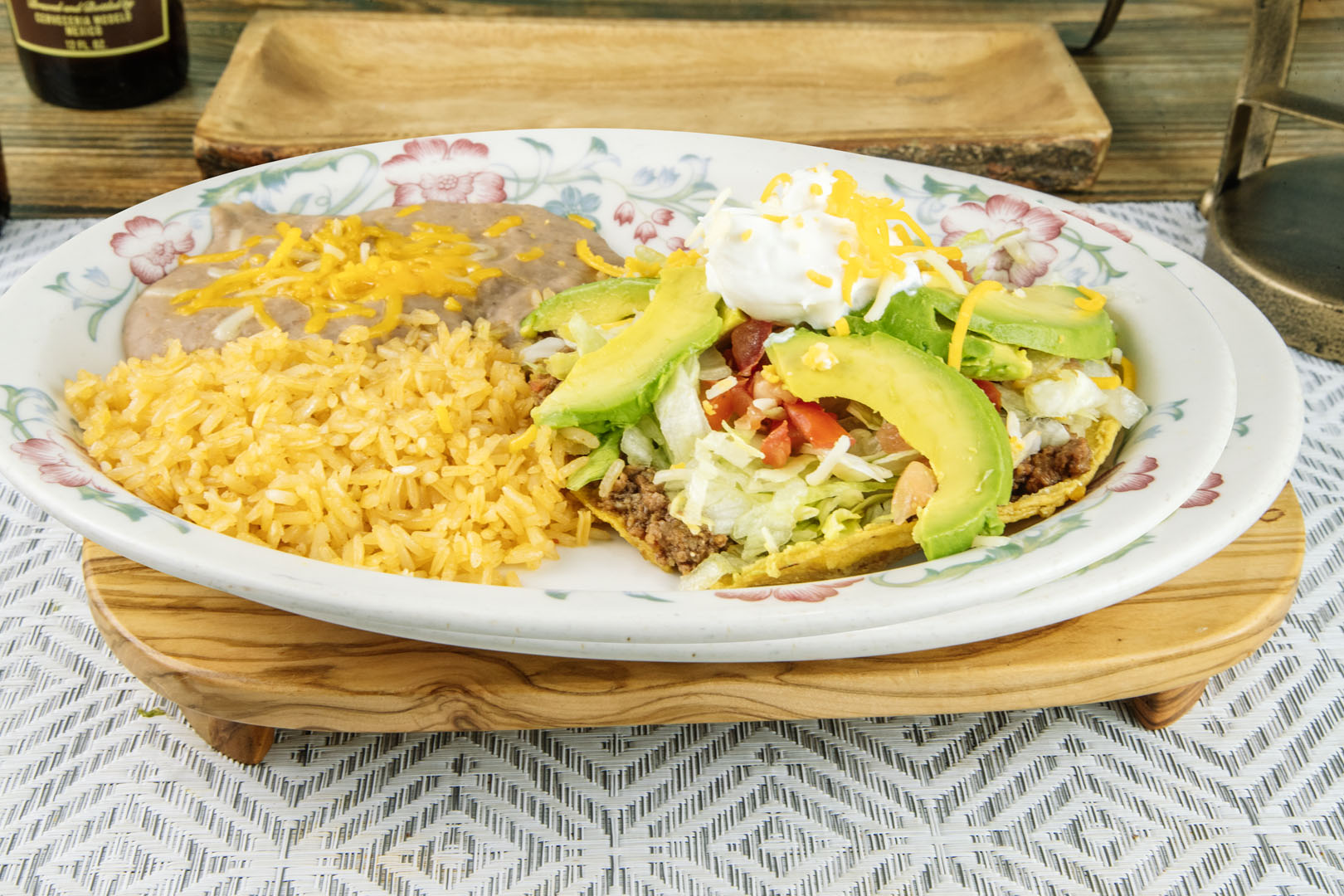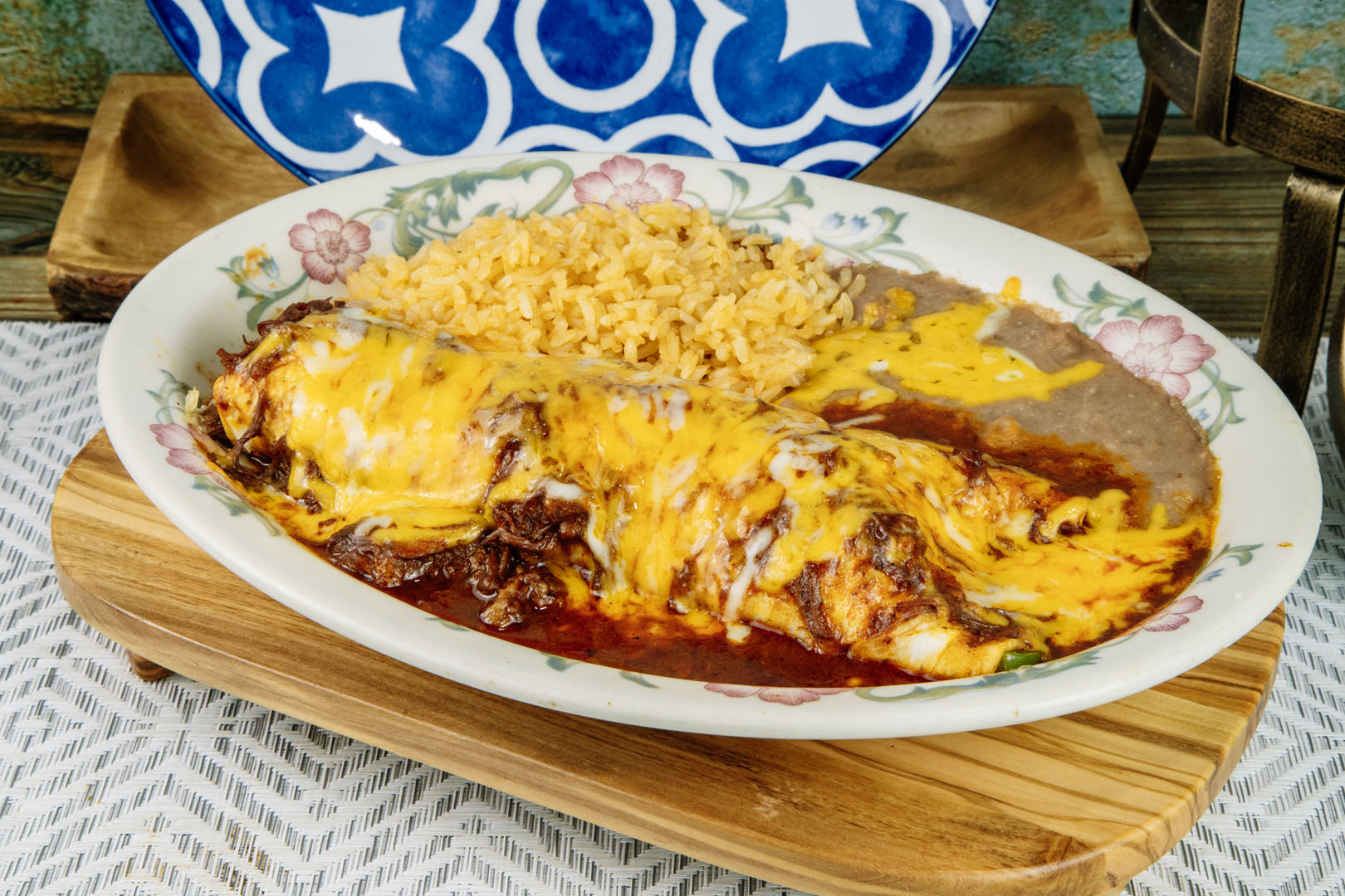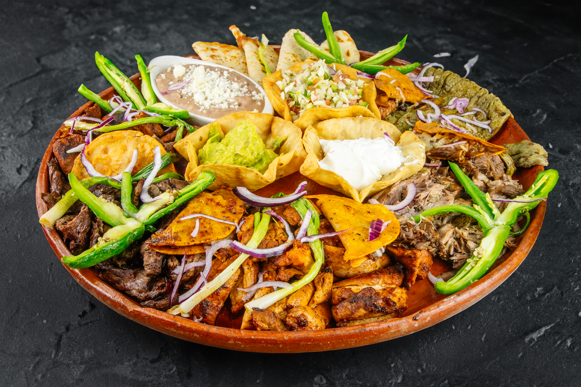 Chicken, steak, shrimp in wrapped bacon, cactus, green onions, jalapeño, cheese in special sauce. Sauteed in onions & mushroom.
