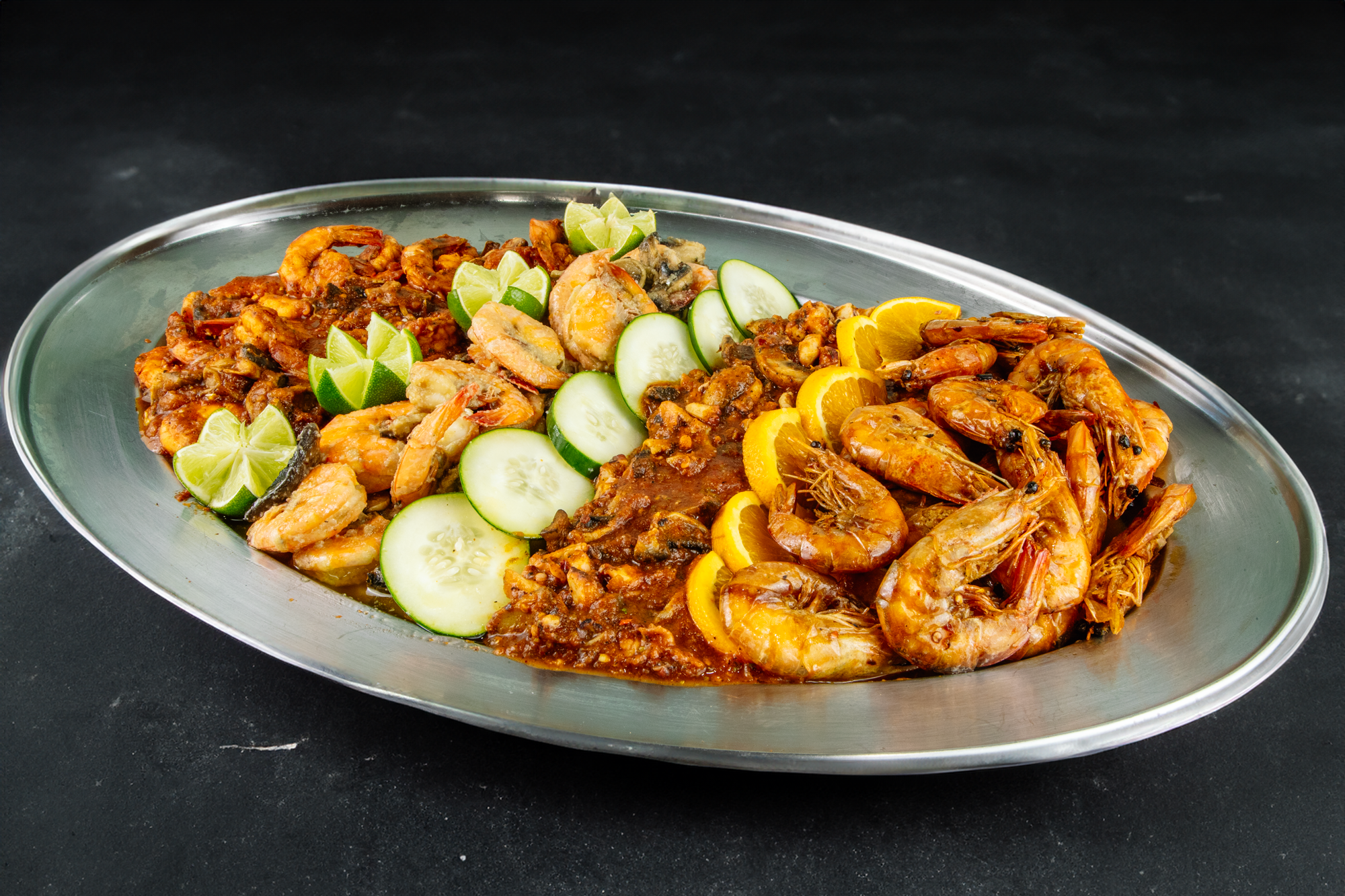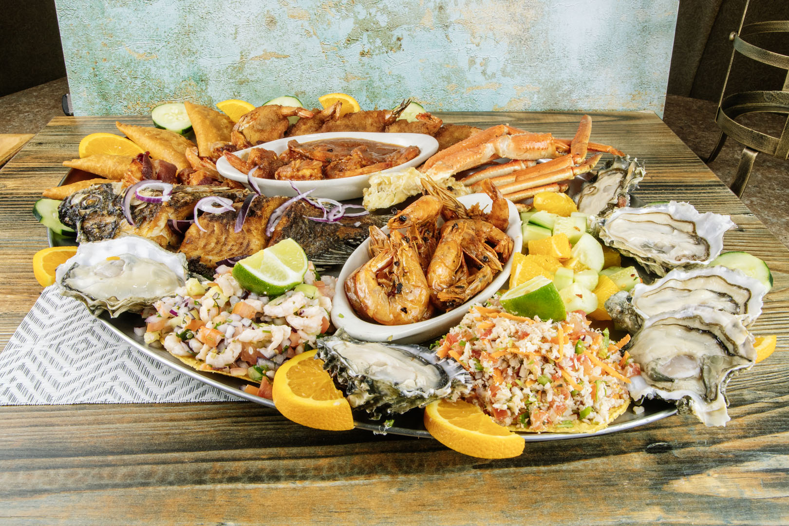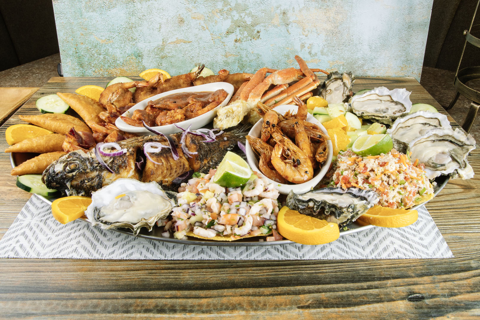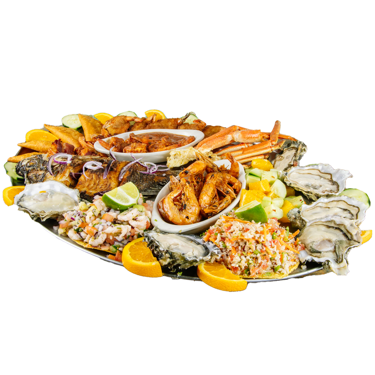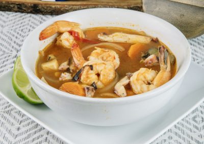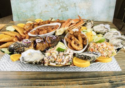 Pescado dorado, ostiones, camarones a la diabla, con tocino, empanizados, piratas, patas de jaiba, empanadas de camaron, tostadas de camaron y pescado.